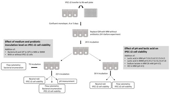 This study confirms that inoculating probiotic bacteria that are deemed safe for IPEC-J2 cells can generate viability losses if the inoculation levels are too high and/or the incubation period is too long. Data from this study allow the formulation of three recommendations to research teams planning to carry out any experiment in which probiotic cultures are blended with animal cell lines in order to assess biological effects: