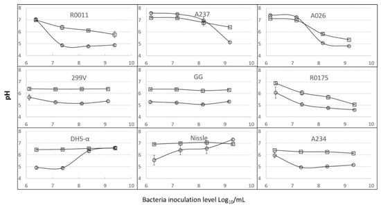 Effect of strain, inoculation level and growth medium on the pH of the media after 22 h of incubation. (○) Maintenance medium—MM; (□) buffered maintenance medium—BMM. Error bars represent the standard error of the mean.