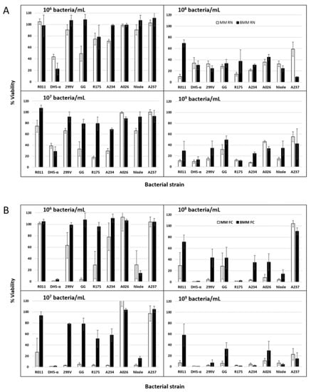 The acidification caused by LB cultures is presumably linked to the production of organic acids resulting from carbohydrate catabolism, and may occur despite the aerobic conditions of the experiment [41]. Strong acidification by LB bacteria is generally linked to bacterial growth [42], and this was observed following incubation (Table S2 and Figure 2). With the LB strains, a correlation was found between the log values of the FCV counts in the incubated media and the final pH (p = 0.02; R = 0.62). In both media, the higher the final population, the lower the pH. The strong variations observed among the strains in terms of changes to the pH of MM or BMM suggested uneven bacterial growth. As a rule, only small changes in the FCV counts were observed when the inoculation level was 109 cells/mL. In this particular case, since the pH often dropped below 6.0, presumably very rapidly, uncoupling between growth and acidification occurred, which is a well-known phenomenon in lactic cultures [42].