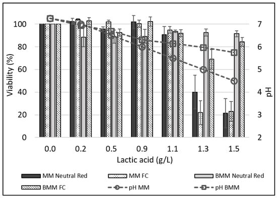 Inoculation with LB cultures resulted in variable acidification levels (Figure 2) and viability losses of the IPEC-J2 cells (Figure 3). Since probiotic cultures produce many antimicrobials (bacteriocins and peptides, H2O2, enzymes) [65,66,67,68,69], it is not known to what extent the pH or antimicrobials generate cytotoxicity. It was therefore decided to ascertain the specific action of lactic acid and pH. MM were acidified to pH values between 7.0 and 4.5 using lactic acid, and the effect on IPEC-J2 viability in bacteria-free acidified media was evaluated. The highest viability losses were noted when lactic acid levels produced pH values below 5.5 (Figure 4). There was a significant correlation (R = 0.80; p = 0.02) between the pH and cell viability in the MM. When the same levels of lactic acid were added to BMM, significantly higher pH levels were reached, and animal cell viability losses were lower (Figure 4). A paired t-test showed that, overall, the IPEC-J2 viability was 25% greater in BMM than in MM. An assay was carried out that involved adding sodium lactate to MM at a concentration of 1.5 g/L, which was the same quantity of lactic acid used to reach a pH of 4.5 (1.5 g/L). The MM containing 1.5 g/L of sodium lactate had a pH of 7.0. After 16 h of incubation in the lactate–MM, the IPEC-J2 cell viability remained at 100% (Table S3). Thus, the detrimental effect of acidification seems to be linked to the pH itself.
