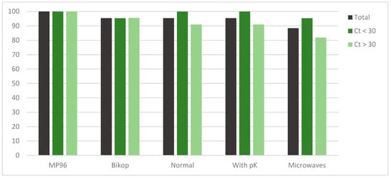 Viral load, reflected as Ct, has an influence on these results. When a threshold was made in Ct, all the procedures that were analyzed were sensitive enough for samples which were amplified under 30 cycles, with results over 95% for every method. Over 30 Ct, or even more, over 32 Ct, a decrease in sensitivity happens, especially with the microwaves method.