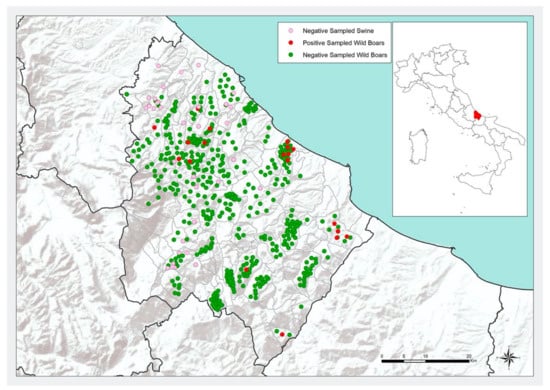 HEV is classified into four genotypes. Genotype 1 (g1) and g2 cause infections in humans in developing countries, while g3 and g4 are considered zoonotic, and pigs and wild boars are recognised as the main reservoir. Many authors have reported evidence of direct transmission of HEV g3 and g4 from animals to humans through the consumption of undercooked meat [14]. The mortality from HEV in human beings is generally low (less than 1%), but disease severity has been reported in 28% of pregnant women, and the genotype involved is, according to the case, only Genotype 1. Actually, HEV is also responsible for neurological manifestations such as Guillain-Barré syndrome, neuralgic amiotrophy (NA) and meningoencephalitis. The cases studied concern Genotype 1 in Asia and Genotype 3 in Europe. The same genotypes are also involved in thrombocytopenia and membranous glomerulonephritis. In India, a lot of cases of acute pancreatitis have been associated with Genotype 1, which is also responsible for different patterns of anaemia. Further, Genotype 3 in immunosuppressed and haematolagical patients can cause chronic hepatitis and cirrhosis induced by liver fibrosis [15]. In Italy, most of the data about prevalence of HEV in wild and domestic animals are limited to central-northern regions, where g3 is the most commonly found with the related subtypes 3e and 3f [16]. Less data about the circulation of HEV are available for pigs, wild boars and humans from Italian southern regions, as well as for the genotypes and subtypes involved. The aim of this study was to estimate the prevalence of HEV in pigs and in the wild boar population of Chieti province (Abruzzo Region, Central Italy) in order to provide more data supporting an evaluation of the overall national prevalence.