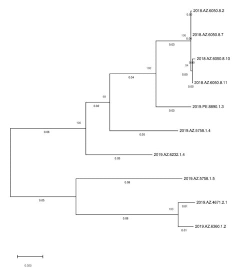 The analysis carried out for HEV WGS gave conclusive results only for one sample. The total length of the draft genome generated from the one HEV positive RNA sample (2019.PE.8890.1.3) and mapped against the reference genome KU176129 was 7140 bp. Querying the HEVnet tool database, the draft genome showed to belong to genotype 3c and was submitted to the National Center for Biotechnology Information (NCBI) under the following accession number: OK665855. In order to verify the relatedness occurring among HEV strains circulating in Abruzzo, we clustered the HEV sequence obtained in this study with the HEV 3c Abruzzo sequences previously published by Aprea et al., 2020 [17] using the Geneious Prime software [29]. The results showed that 2019.PE.8890.1.3 clustered with HEV sequences obtained in wild boars kept in L’Aquila province (2018.AZ.6050.8.2, 2018.AZ.6050.8.7, 2018.AZ.6050.8.10 and 2018.AZ.6050.8.11). (Figure 2).