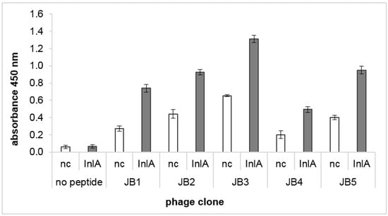 Phage-display-derived phage clones show binding to InlA. 1 µg InlA was coated on microtiter plates and incubated with 3 × 1010 pfu peptide-presenting phage clones. Bound phages were detected by ELISA as described in Materials and Methods. Averages and standard deviations of three independent measurements are shown. nc: wells without InlA coating. JB1: GLHTSATNLYLH, JB2: DSQFNKYSIATV, JB3: SGVYKVAYDWQH, JB4: QFDYMRPANDTH, JB5: SNSIDKVNRPIN.