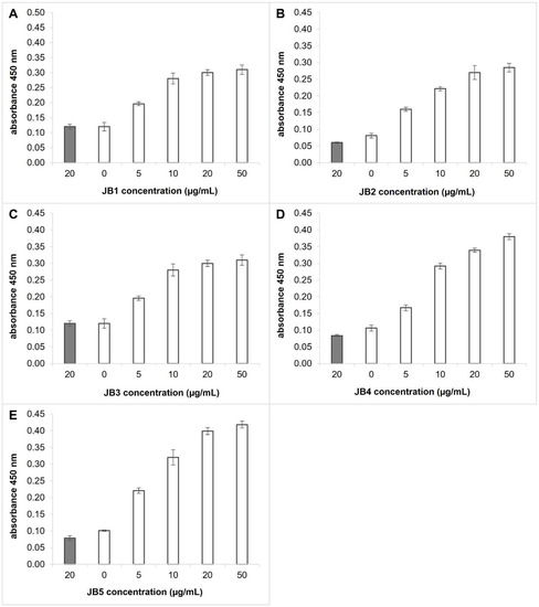 Synthesized peptides JB1, JB2, JB3, JB4, and JB5 bind to InlA. Wells of a microtiter plate were coated with 1 µg InlA blocking and incubated with increasing concentrations of FAM-labeled peptides. Grey bars represent the negative control with no InlA and incubation with 20 µg/mL peptide. Binding peptides were detected by ELISA using anti-FITC:HRP conjugate and measurement of absorbance at 450 nm. Means of three independent measurements and their standard deviations are shown. JB1: GLHTSATNLYLH (A), JB2: DSQFNKYSIATV (B), JB3: SGVYKVAYDWQH (C), JB4: QFDYMRPANDTH (D), JB5: SNSIDKVNRPIN (E).