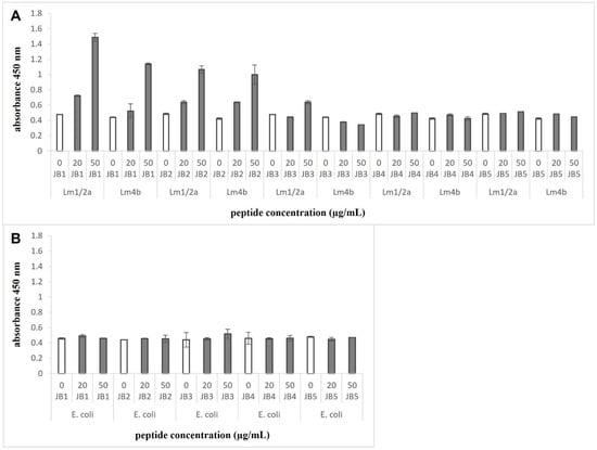 The peptides were tested by whole-cell ELISA to determine their ability to bind L. monocytogenes and non-target bacteria E. coli. Two different serotypes of L. monocytogenes were compared using the pathogenic serotypes 4b and 1/2a expressing InlA. All five peptides were incubated individually with the bacteria. Interaction of the peptides was detected by absorbance measurements. The results in Figure 3 demonstrate that peptides JB3, JB4, and JB5 exhibited low or no interaction with L. monocytogenes as well as with E. coli, while peptides JB1 and JB2 bound to L. monocytogenes but did not bind to E. coli. For JB1, higher absorbance values were measured, demonstrating that JB1 was more sensitive to L. monocytogenes than JB2. The signals of serotype 4b and 1/2a showed almost no difference in the values, indicating that these peptides were able to bind to both serotypes.