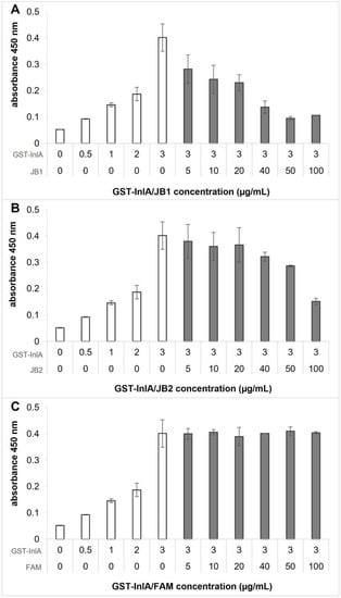 The effect of InlA-binding peptides on the interaction capability between InlA and E-cad was assessed by ELISA. Signals of bound InlA were measured with and without prior incubation of InlA with the peptides JB1 and JB2. The binding of InlA to E-cad was significantly reduced by the peptides JB1 and JB2 (Figure 5). Especially peptide JB1 inhibited the interaction between InlA and E-cad with increasing concentrations. At 50 µg/mL JB1 no interaction signals were detectable. Inhibitory effects as a result of the presence of the FAM tag were excluded by incubation with FAM instead of the peptides (Figure 5C). The results suggest that JB1, JB2, and E-cad interact with the same sites, or sites located close by in InlA.