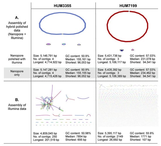 The higher error rates of third generation (long-read) DNA sequencing can be corrected by polishing a long-read assembly using higher accuracy second-generation (short-read) DNA sequencing data from the same genome. Pilon is a program that uses short-read datasets to polish assemblies by correcting bases and fixing small-scale mis-assemblies [23]. Polishing the Nanopore assemblies with the Illumina data had only minor impact on the overall assemblies and annotations (Figure 1A); the bioinformatic workflow is illustrated in Figure S1. Hybrid polishing the HUM3355 genome made only very slight changes to the estimated sizes of replicons. Hybrid polishing of the HUM7199 genome reduced the overall estimated size by 3656 bp (less than 0.07%), yet retained the three replicon architecture resolved by Nanopore alone.
