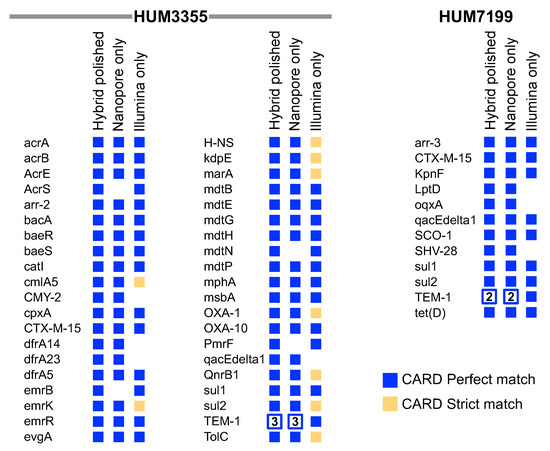 Antimicrobial resistance genes identified by CARD in HUM3355 and HUM7199 whole genome assemblies. Perfect matches to reference genes in the hybrid polished assemblies are compared to the Nanopore only and Illumina only assemblies. Genes are listed alphabetically using their CARD short names. An empty space indicates that the gene was not identified as a perfect or strict match in a genome assembly. The number of copies of beta-lactamase TEM-1 are indicated in open squares.