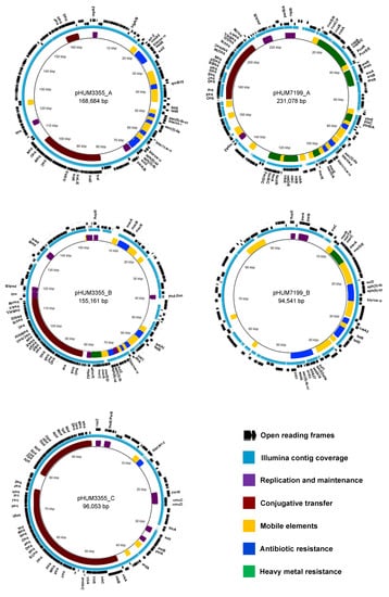 Three plasmids pHUM3355_A (168,684 bp), pHUM3355_B (155,161 bp), and pHUM3355_C (96,053 bp) from E. coli HUM3355 and two plasmids pHUM7199_A (231,078 bp) and pHUM7199_B (94,541 bp) from K. pneumoniae HUM7199 were detected. Each of the five plasmids identified in this study were circularized in the assembly workflow, consistent with the dominance of circular plasmids in Enterobacteriaceae. Annotated features are listed in Table S1. Each plasmid belongs to a different incompatibility group and each is a mosaic of gene islands (Figure 3). Four plasmids, pHUM3355_A (IncA/C2), pHUM3355_B (IncFII/IncFIB/IncQ1), pHUM3355_C (IncI1α), and pHUM7199_A (IncFIB(K)/IncFII(K)) are predicted to be conjugative since they carry complete conjugative transfer modules (relaxase, Type 4 Coupling Protein, and Type 4 Secretion System-Mating Pair Formation) in the following MOB relaxase family categories: pHUM3355_A (MOBH), pHUM3355_B (MOBF), pHUM3355_C (MOBP1), and pHUM7199_A (MOBF). Only pHUM7199_B (IncR, IncFIA(HI1)) is classified as non-conjugative as it carries neither conjugative nor mobilization genes.