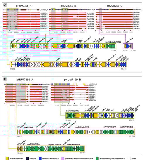 Comparative BLAST analysis and genetic context of antimicrobial resistance genes. (A) HUM3355 plasmids, and (B) HUM7199 plasmids.