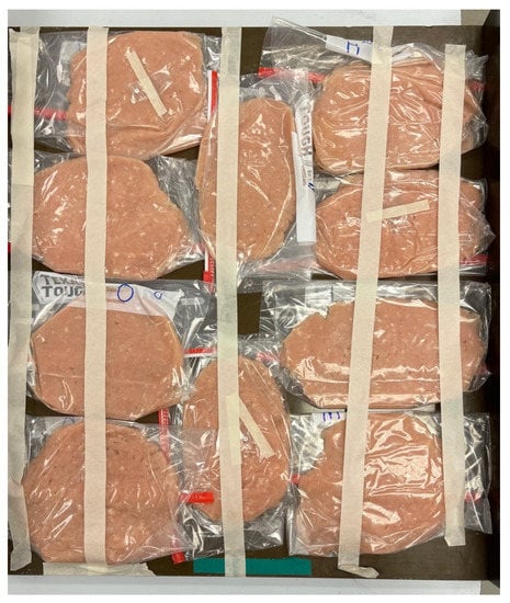 Refrigerated ground chicken meat (97% lean) was purchased from a College Station, TX, USA retail grocer and immediately returned to the FML. Upon return, 250 g aliquots of chicken were aseptically weighed and placed in polyethylene refrigerator/freezer bags and flattened. Bags were transported to the National Center for Electron Beam Research (Texas A&M AgriLife, College Station, TX, USA) and subjected to electron beam pasteurization to reduce numbers of background microorganisms prior to inoculation of pathogen mixtures/cocktails. Two hundred and fifty-gram samples packed in Ziploc pouches were arrayed as depicted in Figure 1. Chicken packages were irradiated to a target of at least 10.0 kGy via the Tower accelerator (10.0 MeV), positioning the electron beam horn above the chicken samples; samples were passed through the accelerator once. A dose absorption study was completed using three alanine pellets positioned at differing locations within the packaged chicken array. Resulting minimum and maximum dose absorptions were 10.09 and 11.39 kGy, respectively. The mean absorbed dose was 10.71 ± 0.51 kGy, and the dose uniformity ratio (DUR) was 1.13 (11.39 kGy/10.09 kGy).