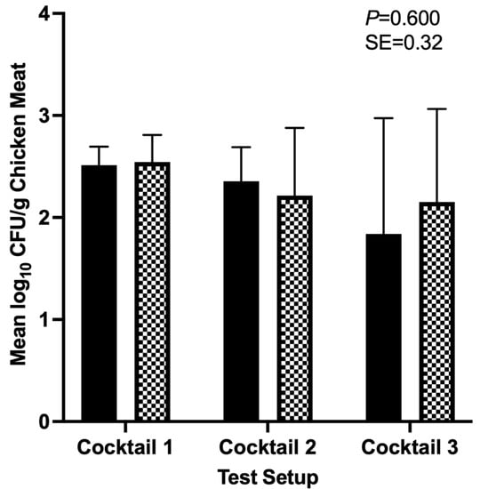 Least squares means of Escherichia albertii on MXgMac (solid black bars) and XRM-Mac (checkered bars) recovered from inoculated ground chicken meat, following incubation of inoculated plates for 24–36 h at 36 ± 1 °C. Bars indicate the mean of triplicate identically completed replicates, with each replicate possessing three independently completed samples (n = 9). Error bars depict one sample standard deviation. SE: pooled standard error.
