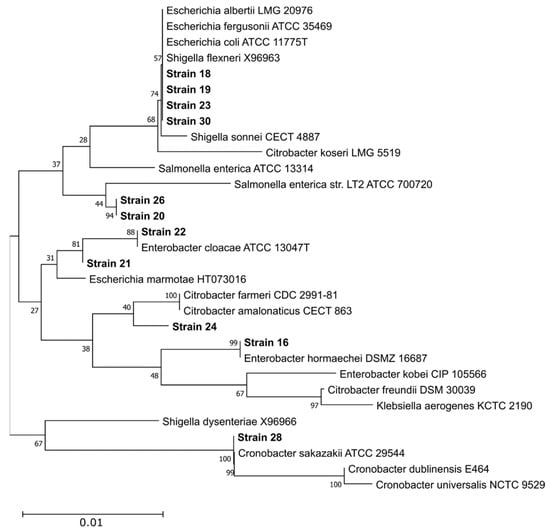 Following completion of colony isolation, DNA extraction, and 16S rRNA gene sequencing by described procedures, no isolated organisms displaying non-fermentation on MXgMac from chicken feces/litter samples were identified as E. albertii. Of 22 NCBI-submitted isolate sequences, five isolates were identified by the RDP Classifier as belonging to the Escherichia/Shigella genus grouping, with one being identified by BLAST alignment as most closely related to S. sonnei, with the remaining four most closely related to E. coli (Table A1). Figure 4 below depicts phylogenetic relatedness of isolates from chicken litter/feces samples. This analysis illustrates that it was difficult to unambiguously assign strains to the species level based on available partial 16S rDNA sequences, with the possible exceptions of strain 22 (E. cloacae), strain 16 (E. hormaechei), and strain 28 (C. sakazakii). The necessity for improved techniques for E. albertii isolation is clearly apparent, such as the pre-application of rigorous selective enrichment to prohibit growth of undesirable microbes at the expense of E. albertii isolation.