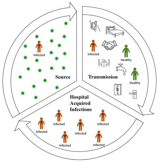 Transmission of pathogens is central to the HAI chain [,], but understanding the mechanism and contribution of fomite-mediated transmission of nosocomial pathogens to the risk of developing HAIs requires evaluation of complex interactions and interventions within the healthcare settings []. Numerous publications have highlighted the role of contaminated environments in the transmission of nosocomial pathogens, including multidrug-resistant organisms [,,], HAI outbreaks associated with MRSA [], vancomycin-resistant Enterococcus (VRE) [,], and Clostridioides difficile []. If not controlled, the HAI cycle continues until the carriers infect the healthy individuals inside the healthcare premises, as illustrated in Figure 2.