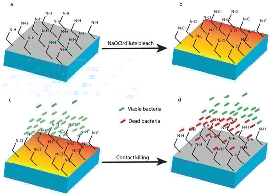 N-halamine coatings provide for AMCs with broad spectrum activity, non-toxicity, low cost, eco-friendly nature, ease of application, and rechargeability [,]. In particular, N-halamine coatings offer the advantage of a surface that can be cleaned and recharged by using a dilute-bleach solution (see Figure 6). Compared to photocatalytic coatings, N-halamine components do not promote the photobleaching of the coating components. Even though these advantages make N-halamines highly appealing, there are disadvantages regarding the stability of >N-Cl bond and other factors that have negative effects on the inherent antimicrobial properties.