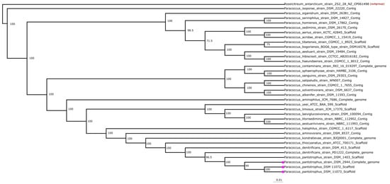 Rectangular phylogenetic tree of Paracoccus, comprising 35 Paracoccus genomes. A dataset of 992 genes per genome, 38,688 in total, was used. All genomes are annotated with genus, species, and assembly level, providing a holistic overview of the genome quality under study. The dataset has 361,894 amino acid residues and 14,113,866 in total. For the out-group and the starting point of the calculation, the genome of the bacterial strain Roseicitreum antarcticum ZS2-28 was chosen due to the high similarity to the Paracoccus genome (94.35% 16S identity). The genomes marked with pink boxes highlight the three strains used in this study and show the close phylogenetic similarity. Strains DSM 11104 and DSM 65 are not shown due to missing genomic data. The tree topology was validated using 100 bootstrapping with 200 iterations, as implemented in the Phylip package. Most branches showed 100% bootstrap support; the values are displayed in the image. The scale at the bottom depicts evolutionary distance.