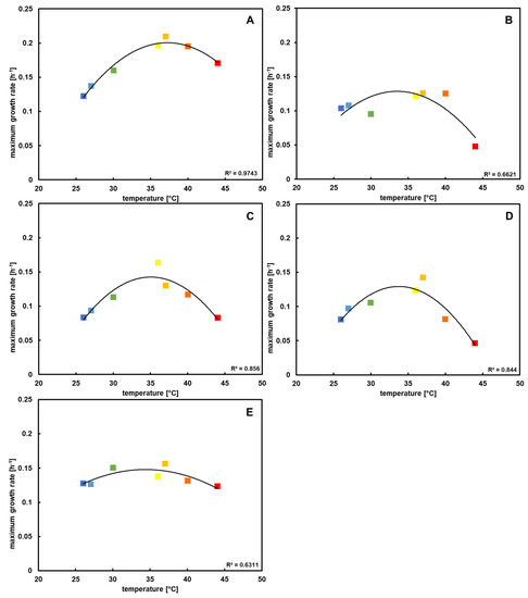 Maximum growth rates retrieved from the temperature block experiment after Kunze, Lattermann [34] plotted against growth temperature. All datasets correspond to a polynomal curve, with each maximum around mesophilic temperatures. (A) DSM 2944T, (B) DSM 11072, (C) DSM 11073, (D) DSM 11104, and (E) DSM 65. The colors of the squares indicate the growth temperature.