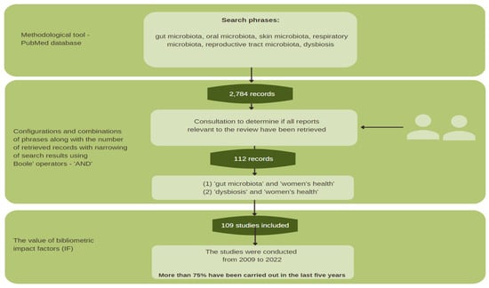 The following paper was edited based on good practices that are commonly used in works of this type. The authors of the paper began by defining the research field. To do this, they searched the PubMed database and found scientific publications consistent with the topic under consideration. The literature items were searched by the authors of the paper and a qualified library employee, using relevant keywords with Boolean operators and their combinations and configurations—gut microbiota, oral microbiota, skin microbiota, respiratory microbiota, reproductive tract microbiota, dysbiosis, and women’s health—using the methodological tool in the form of the PubMed database.