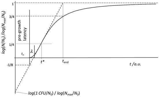 The growth trend according to the present model. The reduced variable on the y-axis holds for any log base. The intercept of the straight line tangent (dotted line) to the growth curve at t = t* dictates the “true” (for the microbial culture) origin of the time scale (t = 0), which can be different from the start of the experiment. It is worth noticing the neat distinction between the pre-growth latency, t0, and the lag phase, λ, considered in most models reported in the literature [].
