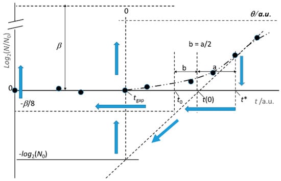 The suitable choice for the time origin for the microbial culture is that, for θ = 0, N = 1 CFU. This implies that, for t = tgap, namely, θ = 0, y = log2(1CFU/N0), as the variable of the y-axis is log2(N/N0). One can accordingly single out tgap on the time scale of the experimenter and replace the t values with θ values. Previous papers [,] suggested an interpretation of tgap.