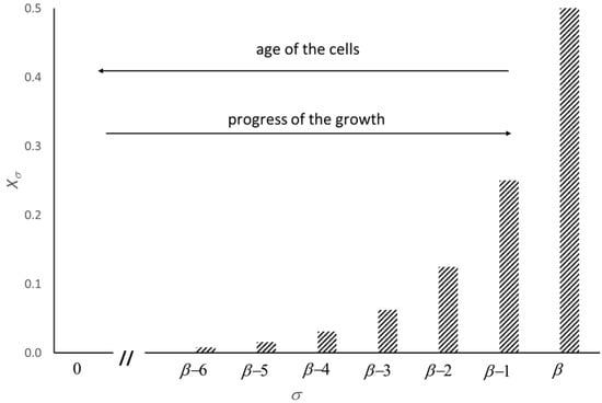 Population fraction, Xσ, of the newborn cells at the duplication step, 0 ≤ σ ≤ β (see text). The plot allows for the ranking of the microbial population according to the age of the cells.