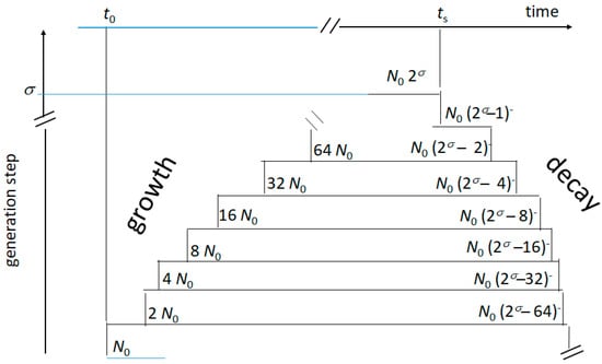 Sketched picture of the growth and decay of the ideal planktonic culture of the present model. At each step, 0 ≤ σ ≤ β (see text), the microbial population doubles (growth) or loses the oldest remaining generation (decay). The distance between steps depends on the variable duplication time (growth, Equation (1)), or shrinks (decay, Equation (4)) as the medium conditions worsen.