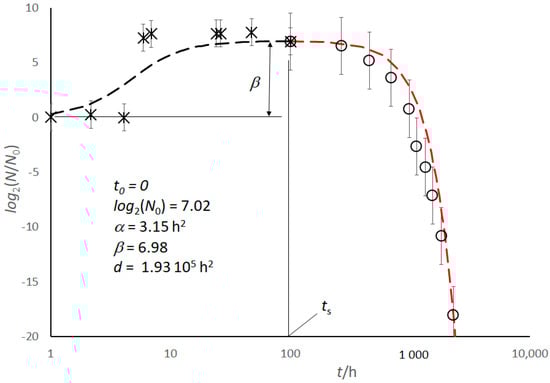 was proposed to describe the decay trend of microbial species that do not activate any physiological reaction to the adverse conditions responsible for the decline of N []. In the above expression, θ is the time from the start of the declining trend and d is an extra parameter defined through a best-fit routine of data relevant just to the decay trend. Equation (3) is a simple choice to meet the need for a reliable fit of the experimental data, but it has no specific connection with the behavior of the ideal planktonic culture for the growth trend.