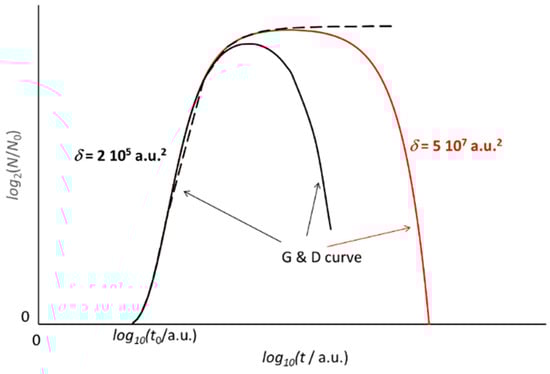 The choice of the start of this phase, ts, is somewhat arbitrary, while its duration largely depends on the value of the parameter, d. The larger d, the flatter the pseudo steady trend. A large d reflects a slow decay of the older generations that are responsible for the early pseudo steady trend of the (N/N0) decay. A small d makes the early decay trend bend downward and form a broad maximum when matched with the rising growth trend, which does not attain any steady level [] (see below). However, the arbitrary choice of ts has a limited impact on the early trend of growth that still obeys to Equation (2).