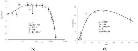 Escherichia coli: the same data as in Figure 6 (A) and Listeria monocytogenes in milkshakes (B) after [], fitted with Equation (13). The relevant parameters (insert) come from the best-fit routine. Bars correspond to the standard error. Time is in a log10 scale.