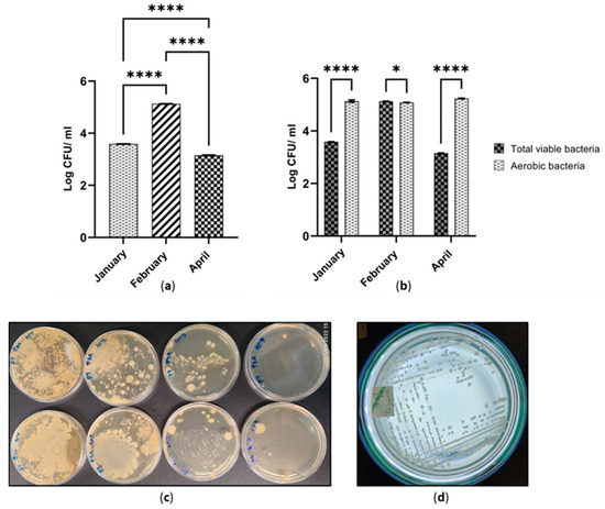 Figure 4d) were greatest compared to the other two months. April recorded the lowest numbers of total viable bacteria (