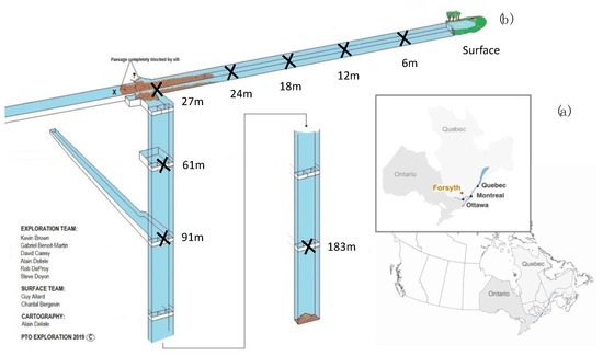 The Forsyth mine (MF) is an old iron mine located in the Gatineau Park in Quebec (Figure 1) part of the National Capital Commission (NCC). It was discovered in 1801 and mining activities started in 1855 until 1918, when all operations ceased. For this study, samples were collected manually in August and September 2019 by the PTO Exploration team, specialized in technical diving in extreme conditions. Nine sampling depths (0, 6, 12, 18, 24, 27, 61, 91, and 183 m) were selected to cover the mine excavated tunnels and shafts (Figure 1). From depths 0 to 24 m, water samples were taken in two 1 L polyethylene bottles, previously sterilized (Nalgene®, Rochester, NY, USA) for microbial identification and in three 50 mL syringes for physicochemical analysis. Biofilm samples were taken in three 50 mL separate syringes from wood, rock, and metal substrates from 0 to 24 m deep and at 27, 61, 91, and 183 m deep in the shaft. Sampling at 183 m was done during one individual dive. This constitutes the deepest known sample collected by a diver in a cold water mine. The diver involved in this feat reports that water became extremely clear—compared to the very turbid water in the tunnel and upper levels in the shaft—after 91 m [24]. All samples were stored at 4 °C in the dark during transport. For water samples, filtration for microbial analyses was carried out using a 0.2 μm polyethersulfone filter (Sartorius®, Midisart, Germany) on the same day as sampling. Filters and biofilms were stored at −80 °C until further processing.