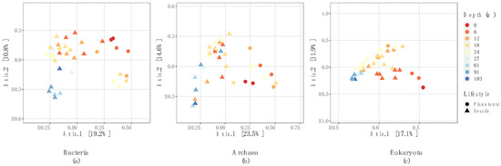In addition, Spearman correlations between alpha diversity indices and depth or all physicochemical parameters were not significant for archaeal and eukaryota communities, as shown in Table S3, but a significant negative correlation (r = −0.713, p = 0.014, Supplemental Material Table S3) was observed between depth and the ASV richness of bacteria communities.