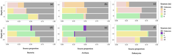Microbial source tracking analyses estimating the contribution of planktonic bacterial (a), archaeal (b) and eukaryote (c) communities from the deeper (12 m) into the surficial layers or bacterial (d), archaeal (e), eukaryoteota (f) from surficial (12 m) into the deeper layer (24 m) communities, across the depth gradient (m). The unknown sources are indicated in grey. Each source correspond to a layer in the depth gradient (m).