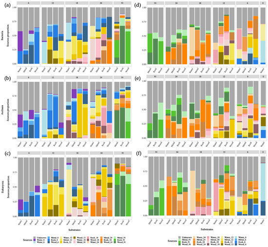 Microbial source tracking estimating the contribution of planktonic and sessile bacterial (a), archaeal (b) and eukaryote (c) communities from surficial into the deeper layers communities, or bacterial (d), archaea (e) and eukaryote (f) communities from the deeper into the surficial layers across the depth gradient and in the different substrates. Each color indicates a source corresponding to a substrate at a specific depth. Unknown sources are indicated in grey.