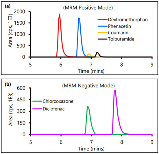 The most intense Q3 fragments were selected for the final multiple reaction monitoring (MRM) method [44]. Four of the control CYP substrates, phenacetin, tolbutamide, dextromethorphan, and coumarin were detected in positive MRM mode (pH 2) (Figure 2a) and the remaining two control CYP substrates, chlorzoxazone and diclofenac, were detected in negative MRM mode (Figure 2b).