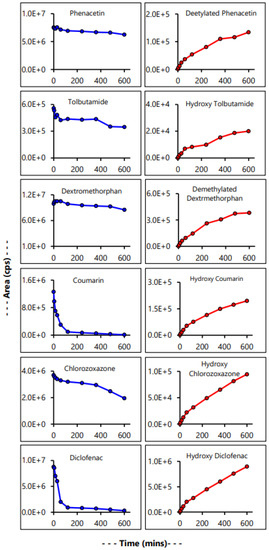 Chlorzoxazone and diclofenac showed better sensitivity in MRM-negative mode, whereas the other four control CYP substrates, phenacetin, tolbutamide, dextromethorphan, and coumarin, provided better sensitivity in MRM-positive mode. Time kinetics study, as determined by the analytical LC-MS/MS method, showed almost complete metabolism of coumarin and diclofenac within 10 h (Figure 6); however, other drugs showed a less extensive, i.e., slower, rate of metabolism. LC-MS/MS analysis also demonstrated formation of the major metabolites for each control CYP substrate (Figure 6). Percent of drug metabolized, and the rate of drug metabolism were calculated according to Equations (1) and (2), as mentioned in the method section, and are listed in Table 3.