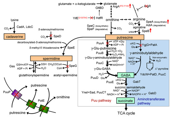 Metabolic pathways of polyamines in E. coli. Mutations introduced into strain KT160 used for putrescine production in [23] are indicated by red symbols and letters. Red arrows pointing upward indicate the overexpressed enzymes, red cross marks indicate the knocked-out genes and red letters on ArgA and YifE indicate the point mutations introduced.