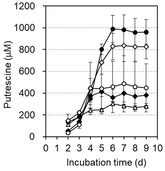 An amount of 5 μL of the filtrates prepared as described above was injected into an HPLC (LC-20, Shimadzu, Kyoto, Japan) equipped with a fluorescence detector (RF-10AXL, Shimadzu) and TSKgel Polyaminepak column (4.6 × 50 mm) (Tosoh, Tokyo, Japan). The instrument was used as described previously [27,28]. The means of the putrescine concentrations of three independent cultures are shown in the results with standard deviations calculated by the STDEV function in Excel.