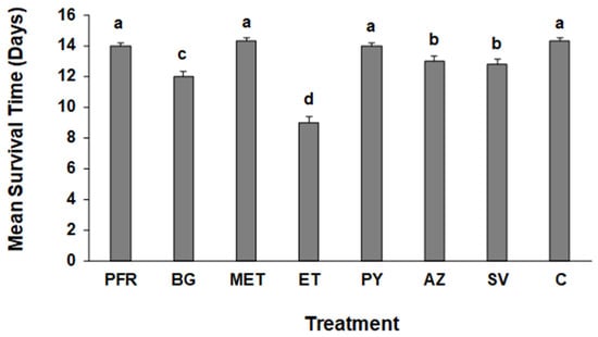 Chicago/Turabian StyleNeal, Anita S., Pasco B. Avery, and Ronald D. Cave. 2023. "Survival Time, Mortality Rate, and Feeding Damage of Adult Myllocerus undecimpustulatus undatus (Coleoptera: Curculionidae) Exposed to Biopesticides in Laboratory Bioassays" Applied Microbiology 3, no. 2: 388-399. https://doi.org/10.3390/applmicrobiol3020027
