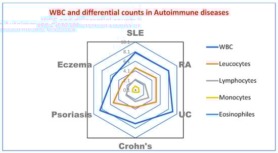 Radar plot of hematological parameters in cases and controls of patients with different autoimmune diseases. WBC: white blood cells.