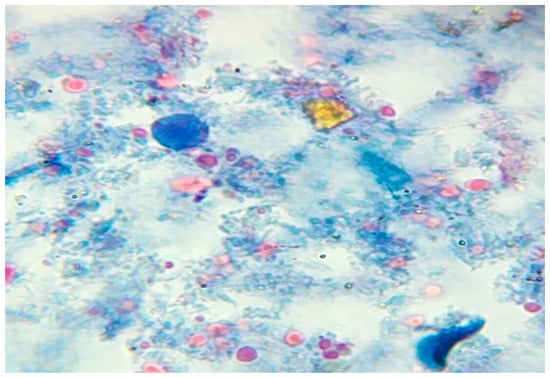 Blastocystis hominis (B. hominis) is an anaerobic, eukaryotic, unicellular protozoan with a global distribution that lives in the human large intestine [2]. B. hominis has colonized between one and two billion people worldwide [3,4]. Evidence of B. hominis detection in the feces of mammals and birds points to the parasite’s zoonotic nature and suggests that these animals may be the cause of many human infections [5]. B. hominis has been classified into four main morphological forms: vacuolar, granular, ameboid, and cystic [3,6]. The fecal–oral route is the main way that B. hominis infections spread [4].