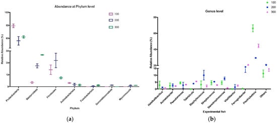 - Ingerslev, H.C.; Von Gersdorff Jørgensen, L.; Strube, M.L.; Larsen, N.; Dalsgaard, I.; Boye, M.; Madsen, L. The development of the gut microbiota in rainbow trout (Oncorhynchus mykiss) is affected by first feeding and diet type. Aquaculture 2014, 424–425, 24–34. [Google Scholar] [CrossRef]