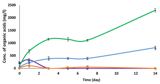 Measurement of organic acids from 0.5% pig manure (PM) cultivated by C. cellulovorans. Symbols: rhombus, formate; square, lactate, circle, acetate; triangle, butyrate. The data represent at least three independent experiments.