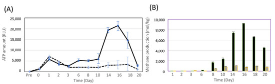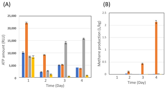 Moreover, 0.5% (w/v) PM, 0.5% (w/v) glucose, 0.5% acetic acid (FUJIFILM Wako Chemicals, Osaka, Japan), and 0.5% (w/v) cellobiose (Sigma, St. Louis, MO, USA) were used as the sole carbon source in 10 mL or 50 mL of C. cellulovorans media and was anaerobically cultivated. The microbial flora of methane production (MFMP) was obtained from methane fermentation digested liquid in January 2017 in Gifu, Japan [32]. C. cellulovorans was precultured with 0.5% cellobiose for 12 h at 37 °C and M. mazei and MFMP were precultured with 0.5% glucose for 12 h at 37 °C, respectively. Cocultivation was performed as approximately 1000 RLU of C.c cells and approximately 20,000 RLU of MFMP cells (C. cellulovorans:MFMP = 1:20) and approximately 1000 RLU of C. cellulovorans cells and approximately 3000 RLU of M. mazei cells (C. cellulovorans:M. mazei = 1:3), respectively. In comparison with cocultivations with 1% acetate and 1% methanol media, C. cellulovorans was precultured with 0.5% cellobiose for 12 h at 37 °C and M. mazei and MFMP were precultured with 0.5% glucose for 12 h at 37 °C, respectively. The precultured cells were inoculated into each medium with 1% acetate or 1% methanol. After the cells were collected by centrifugation, the supernatants and the cells were used for each experiment.