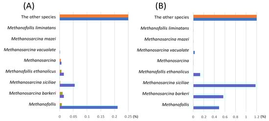 Relative abundance ratio of archaea in MFMP after cultivated with the different carbon sources. After 16S rRNA analysis, the identified archaea were compared. (A) 1% acetate cultivation; (B) 1% methanol cultivation. Bars indicate orange (after 24 h cultivation) and blue (after 72 h cultivation), respectively. The others show the rest of total percentage.