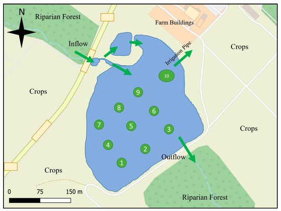Water sampling was conducted from June to September of 2022 at a commercial farm with an actively used irrigation system in Maryland, USA (location withheld at the request of the owners). The irrigation pond measured in this study is approximately 40,000 m2. The property is zoned as cropland and has deciduous forested areas adjacent to the inflow and outflows. The areas to the North and Northeast are designated intensively managed row and garden cropland. The observed pond depths ranged from 0.40 m to 2.36 m with an average depth of 1.22 m. Sampling of the pond was conducted in a grid-like fashion with nine sampling locations each approximately 50 m apart and the 10th location placed at the irrigation intake (Figure 1). The pond is creek-fed from a riparian forest to the North, and water that enters the pond passes through two settling ponds before entering the larger pond. Areas in the Northern and Northwestern portions of the pond were not sampled due to the shallowness of the water.
