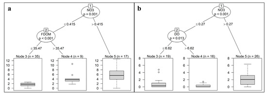Conditional decision trees (cTrees) were computed using water quality variables as inputs and the percentages of resistant E. coli as outputs. Traditional classification and regression trees (CART) operate using recursive binary partitioning to create splits in datasets which help to best distinguish between different values of the target variable (i.e., percentages of resistant E. coli) based on levels of the inputs (i.e., environmental variables). Instead of maximizing purity (or minimizing impurity) in split groups, cTrees use statistical permutation tests to determine whether a split based on a certain level of a parameter leads to a significant or insignificant improvement in model performance. Conditional trees have been shown to deal with multicollinearity and avoid bias and overfitting better than traditional regression trees [27]. cTrees were created using the R software (R Foundation for Statistical Computing, Vienna, Austria) [28] using the ‘partykit’ package [29]. All cTrees were run with default settings except that terminal nodes in the trees had to contain at least 10 observations.