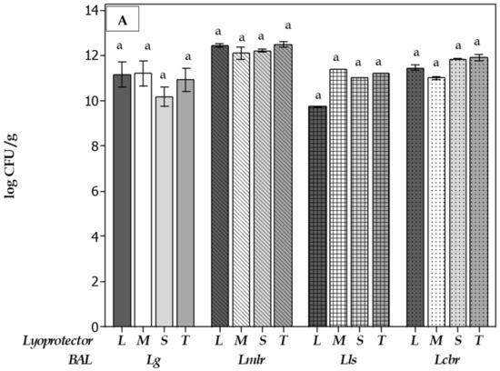 To maintain the high viability of VLB probiotics strains when they are administered, it is necessary to ensure the preservation of their high numbers in the obtained biomass. In this study, freeze-drying was used due to the enhanced stability reached using probiotic micro-organisms during storage via the use of cryoprotectants/lyoprotectants. Therefore, the effect of different cryoprotectants was evaluated (Figure 4).