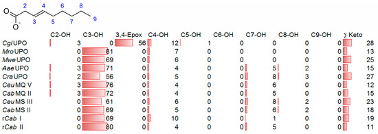 When 3-nonenoic acid was used as substrate, only CglUPO formed the epoxide, and the conversion rate was 55%. In addition, CglUPO formed some minor products indicative of hydroxylation at C2, C4 and C5 positions (Figure 3 and Figure 4, Figure S1). All other tested UPOs favored hydroxylation at C3 (sp2-hybridized carbon, as C4) with rates of 55–80% and interestingly did not form the 3,4-epoxy derivative. Both 3- and 4-hydroxy-3-nonenoic acids were present in their oxo-forms (ketones), as indicated by a significant decrease in absorbance in the UV spectrum. Unsaturated FAs show a non-specific UV-spectrum with an absorption shoulder in the UV region (around 220 nm) caused by the aliphatic double bond (alkenyl) and the carbonyl function of the carboxyl group [28,29]. Thus, when the aliphatic double bond is lost, e.g., after epoxidation, the product loses its UV absorbance between 200 and 240 nm. Since oxo-fatty acids are subject to keto-enol tautomerism, they tend to attenuate or even lose their UV spectrum when the equilibrium is shifted toward the oxo-form [30].